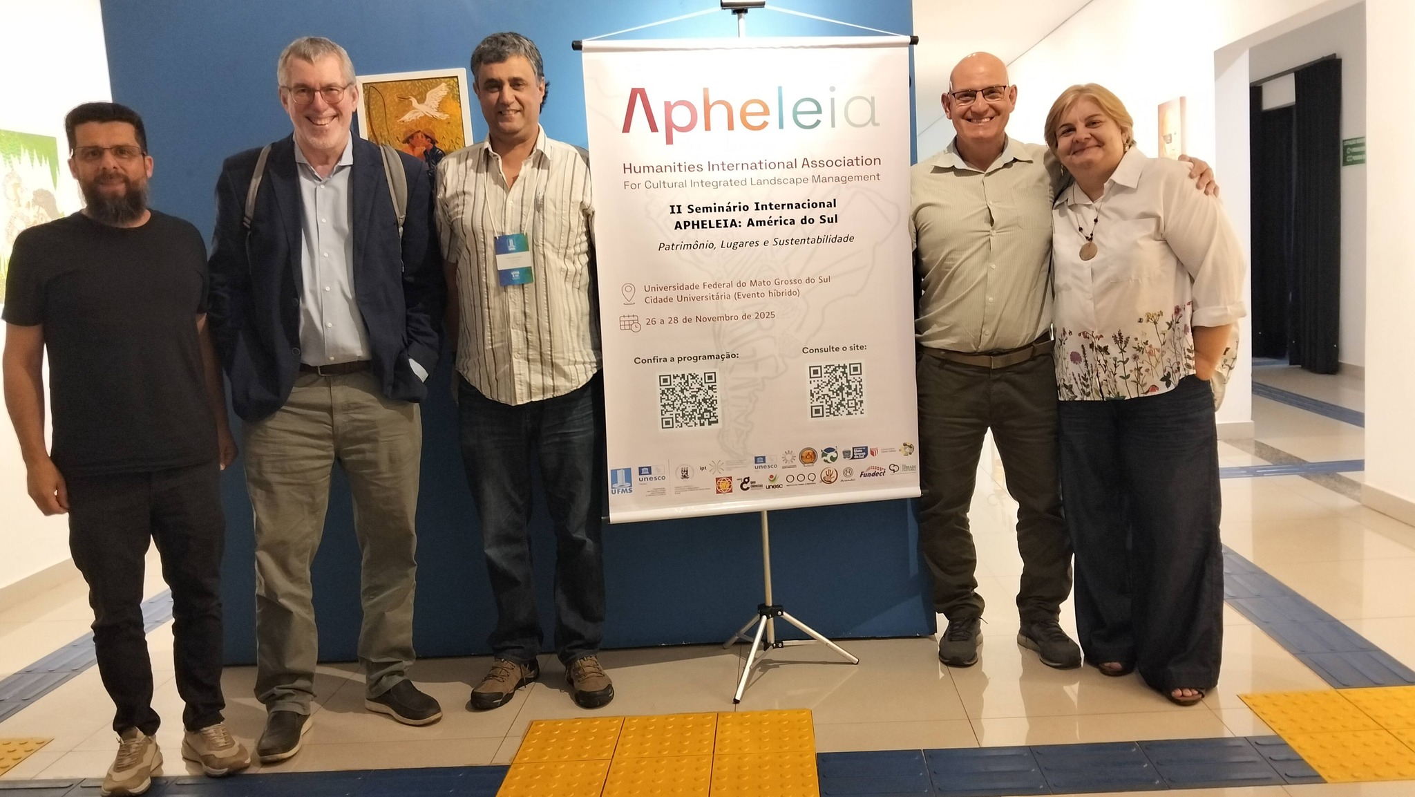 2.º Seminário Internacional APHELEIA América do Sul, realizado de 26 a 28 de novembro na Universidade Federal do Mato Grosso do Sul, em Campo Grande, Brasil. Na fotografia, da esquerda para a direita, encontram-se Juliano Campos (organizador do 1.º Encontro, em 2023, na UNESC, em Criciúma), eu, Rafael Suarez, da Universidad de la República (Uruguai), André Soares (Coordenador da Cátedra Unesco-UFSM de Fronteiras e Migrações e do Observatório Sul-Americano de Patrimónios, Lugares, Humanidades e Artes, estabelecido pela AUGM com a colaboração da APHELEIA) e Lia Brambilla (Coordenadora do 2.º Encontro e Pró-Reitora da UFMS).